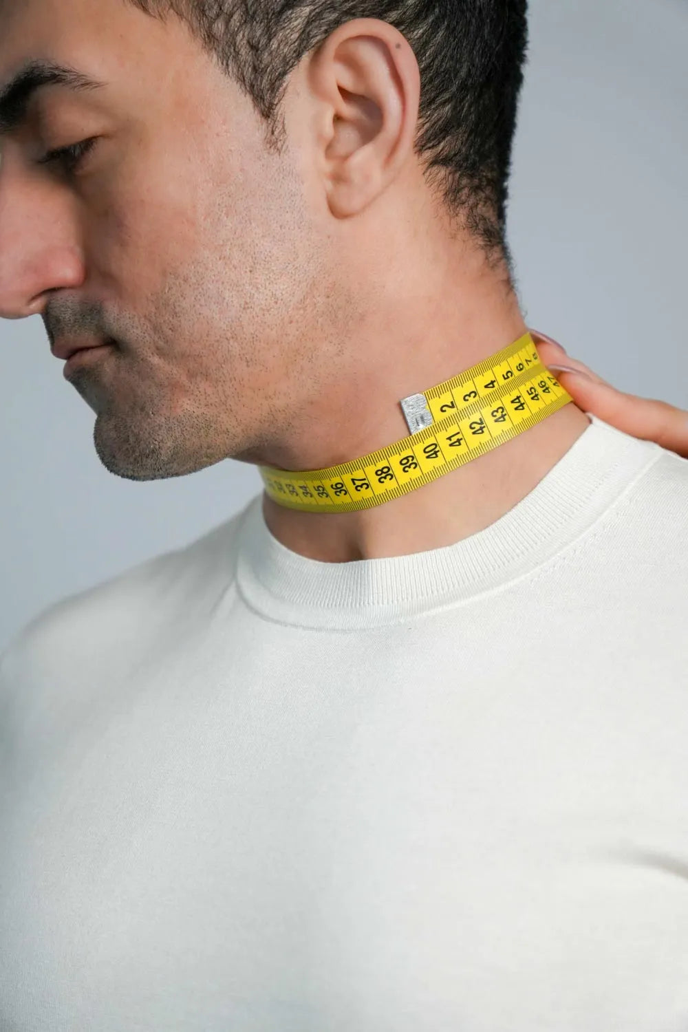 Legen Sie das Maßband in Höhe des Adamsapfels waagerecht um Ihren Hals. Legen Sie einen Finger zwischen das Maßband und Ihren Hals oder fügen Sie etwa 1 cm zum Maß hinzu.